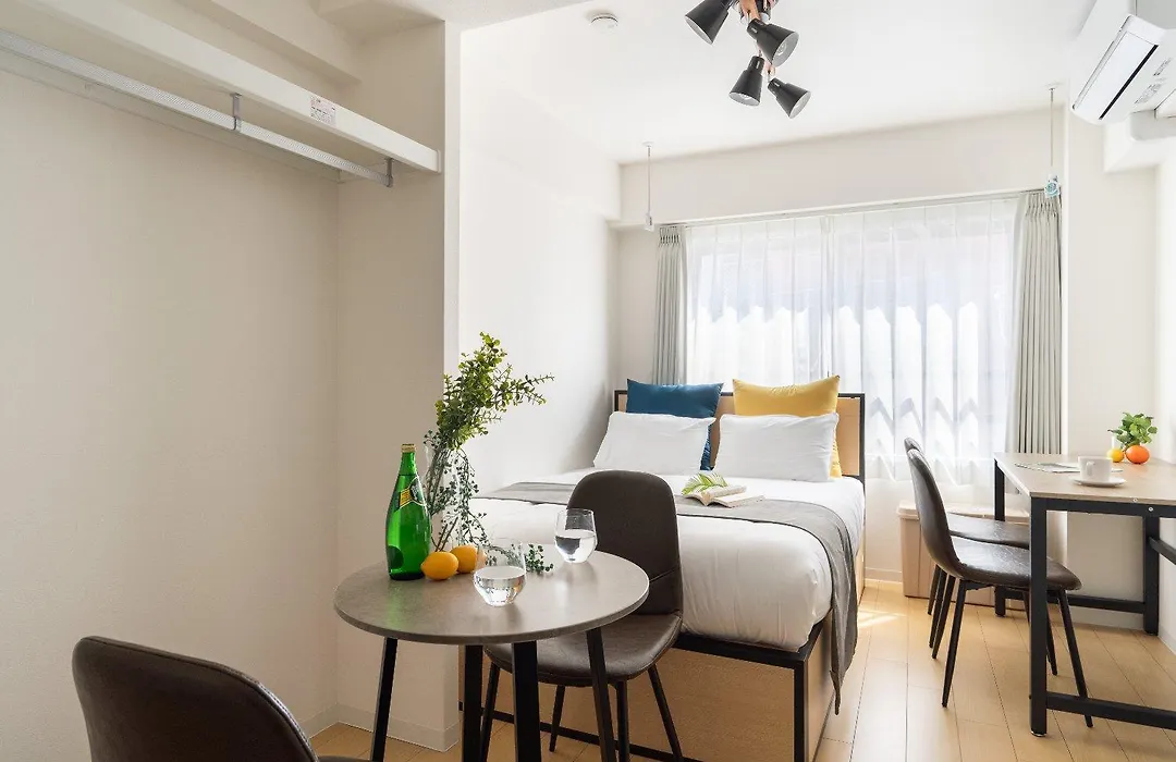 A kitchen at Glicion Oji apartment includes a fridge, a stove top, and kitchenware. Glicion Oji apartment is right around the corner from Oji underground station.
